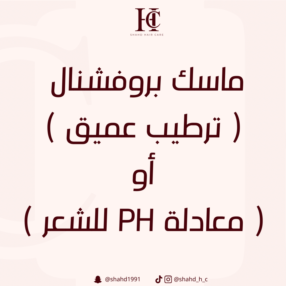 جلسة احترافية مدتها ساعة مخصصة لترطيب شعرك بعمق باستخدام ماسك بروفيشنال. يتم اختيار نوع الماسك بناءً على احتياجات شعرك لتوفير ترطيب فعال، مع تعديل الحموضة والقلوية (PH) لتحقيق التوازن المثالي للشعر .