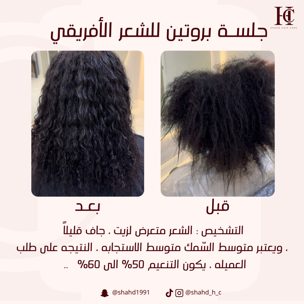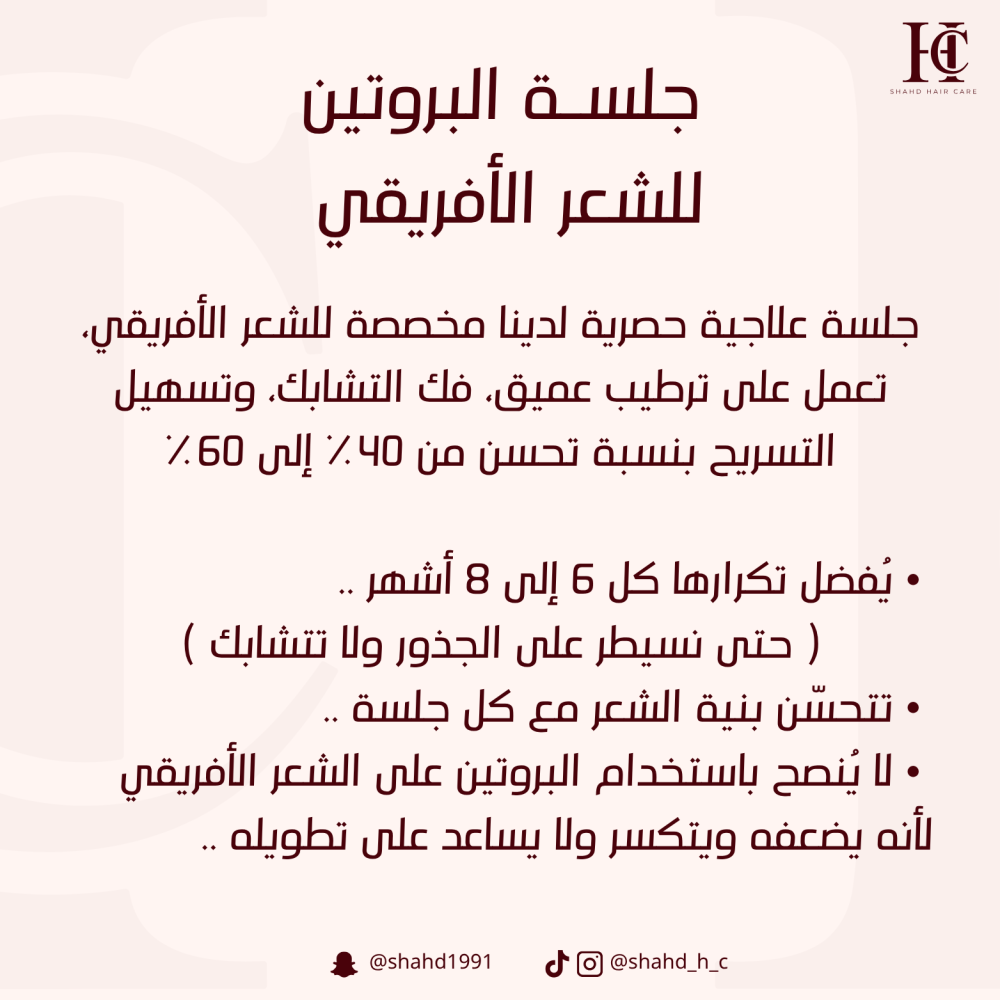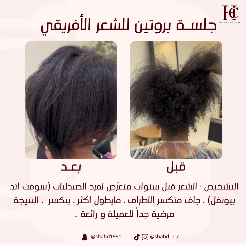 امنحي شعرك العناية التي يستحقها مع جلسة الشعر الأفريقي المقدمة حصريًا من متجر الأخصائية شهد للعناية بالشعر في السعودية . استمتعي بخدمات احترافية ومنتجات صحيّة ، وخاليه من المواد الضّارة ، مُختارة بعنايه تهدف إلى تعزيز جمال شعرك وصحته .
